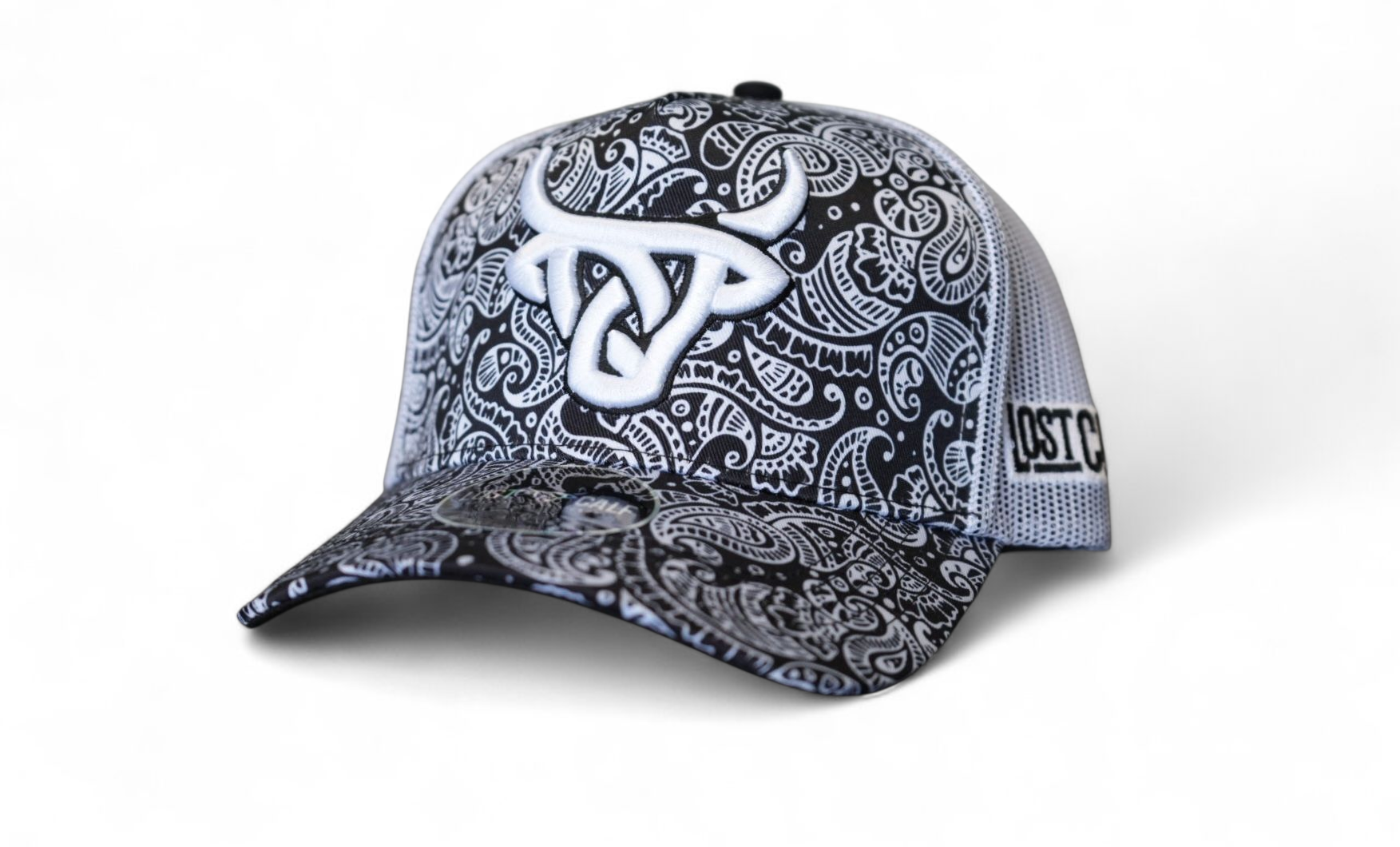 Baseball cap with Lost Calf logo embroidered on front, Lost Calf stitched on left side. Snap back - one size fits all.