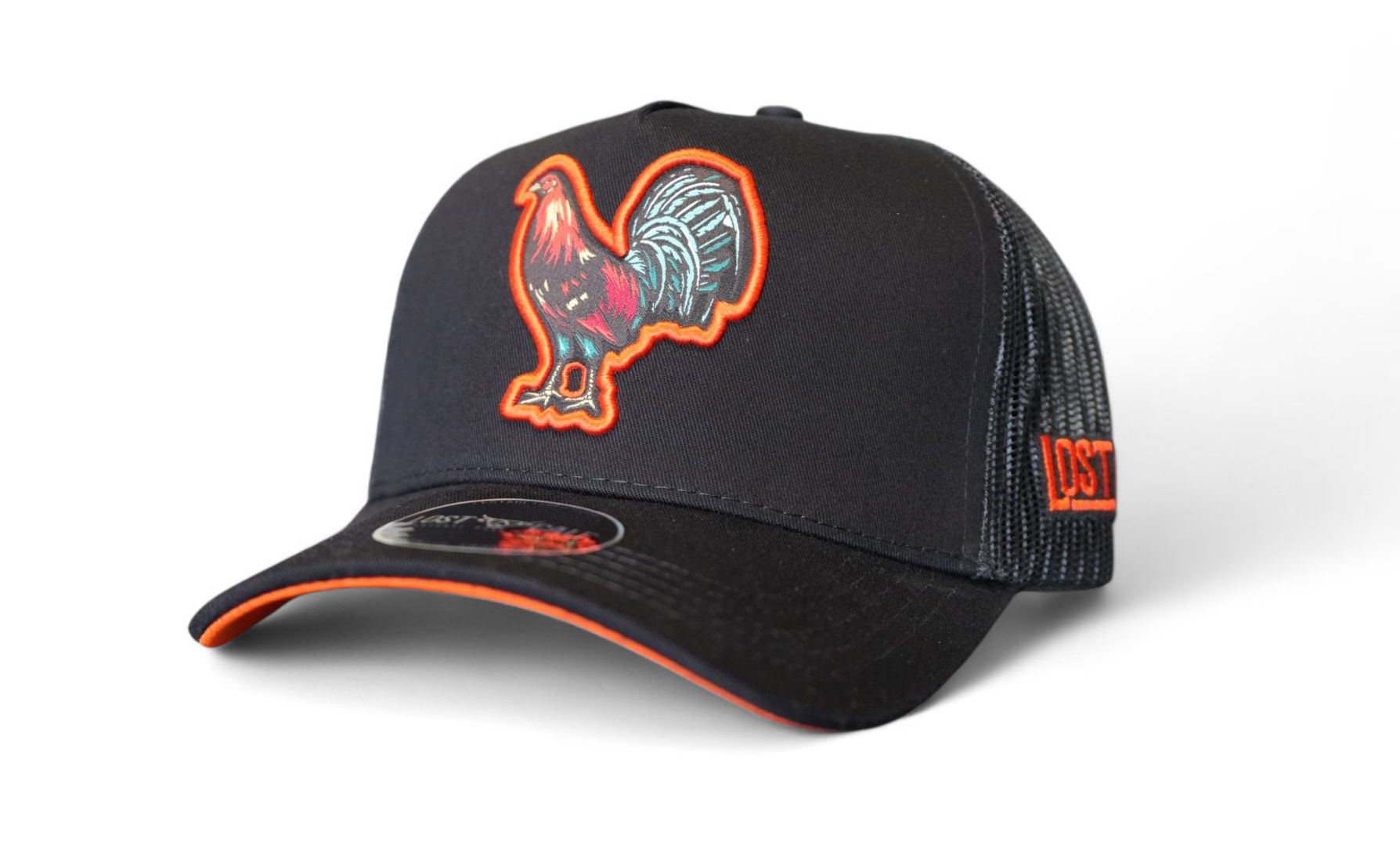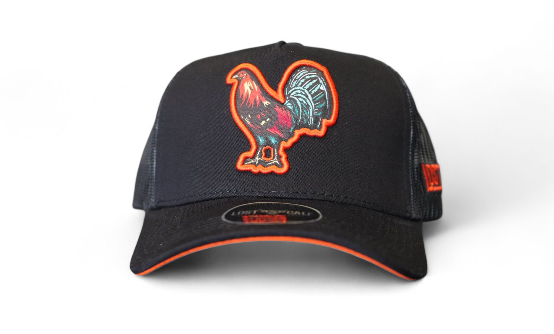 Baseball cap with Rooster logo embroidered on front, Lost Calf stitched on left side. Snap back - one size fits all.
