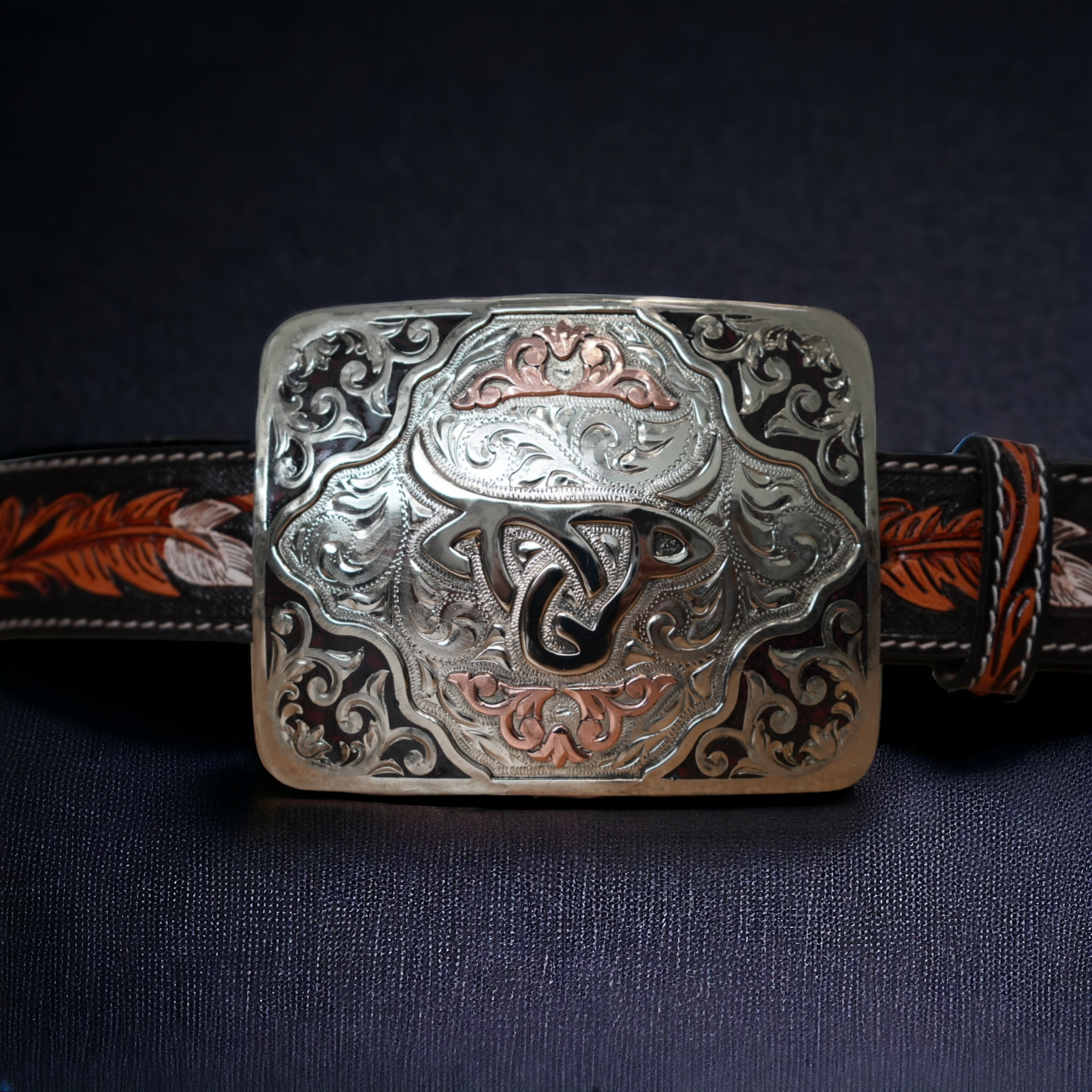 Great Vintage style Buckle. German Silver base with a German Silver bead and rope edge. Copper overlays with Jewelers Bronze flowers.