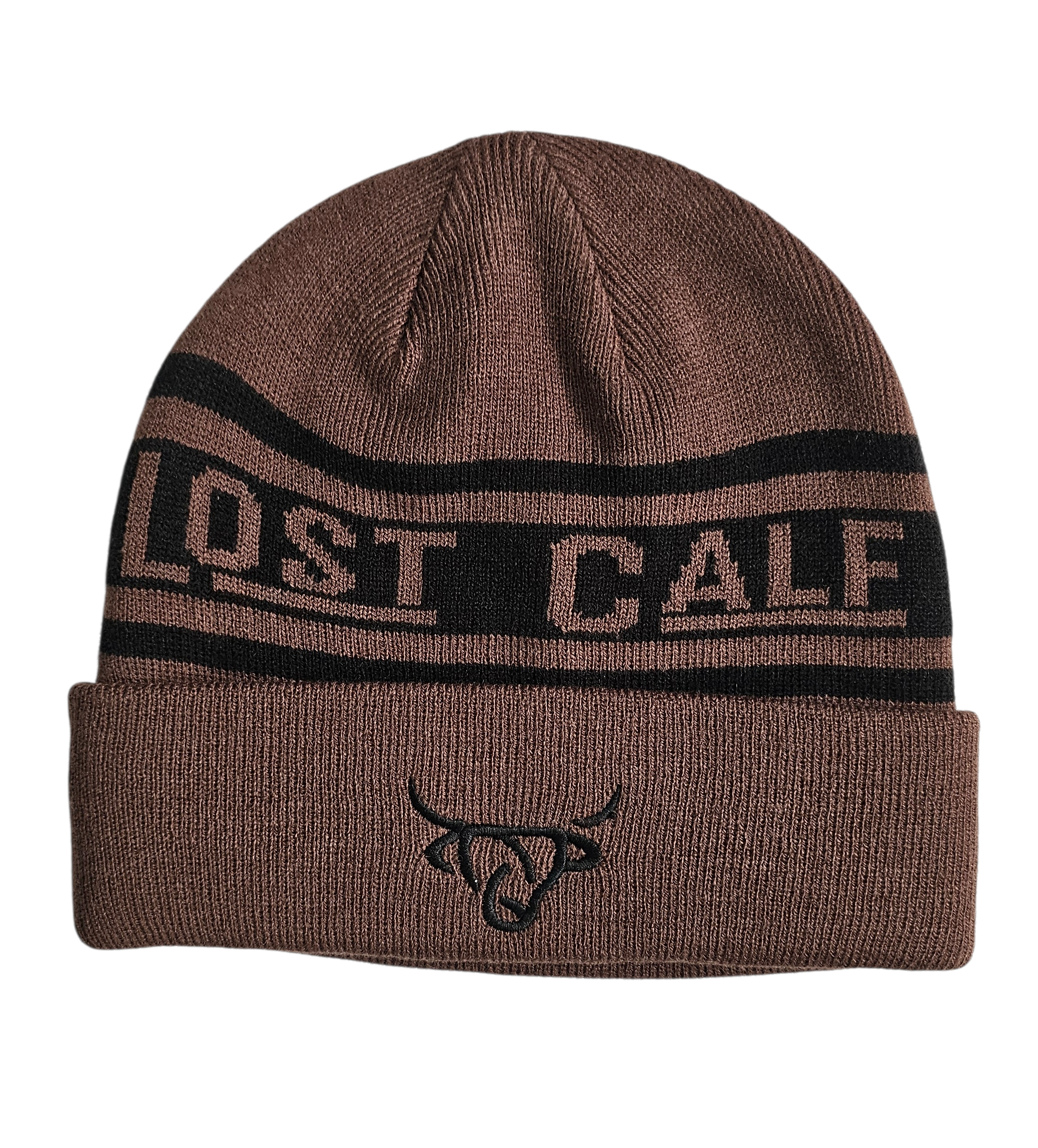 Lost Calf short beanie logo embroidered on front in black. One size fits all .