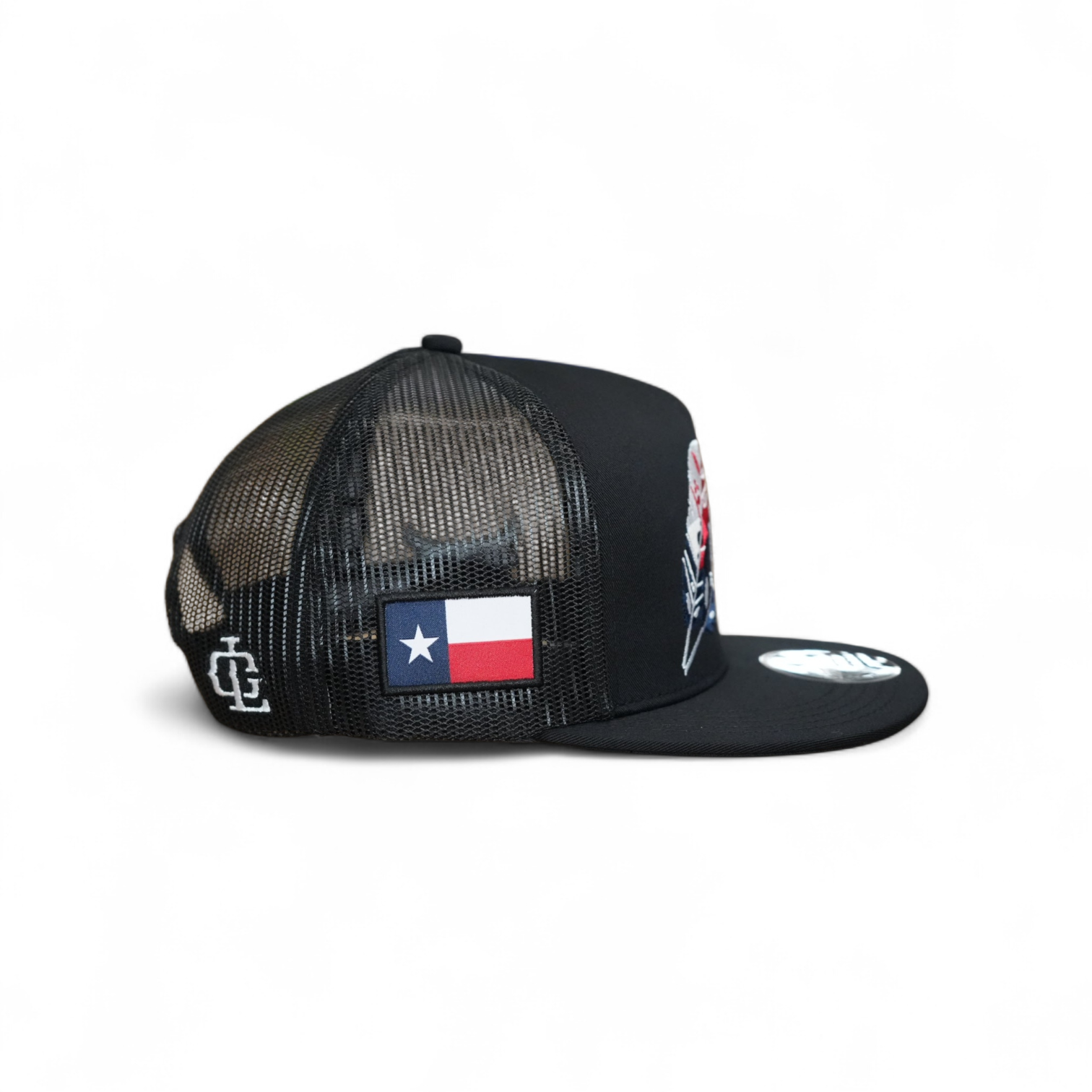 Baseball cap with two feathers logo embroidered on front  , Lost Calf logo on left side.  Snap back - one size fits all.