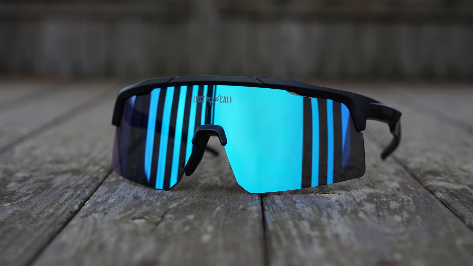 Polarized unisex sunglasses with our Lost Calf laser logo on center lens.