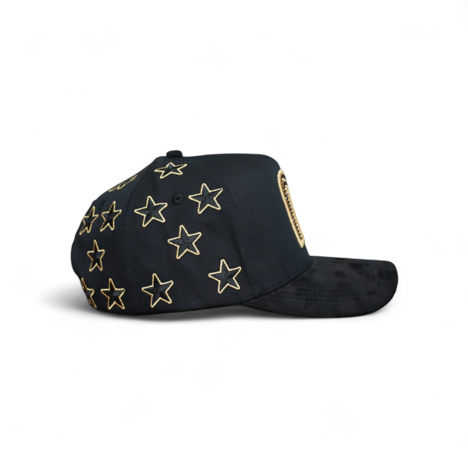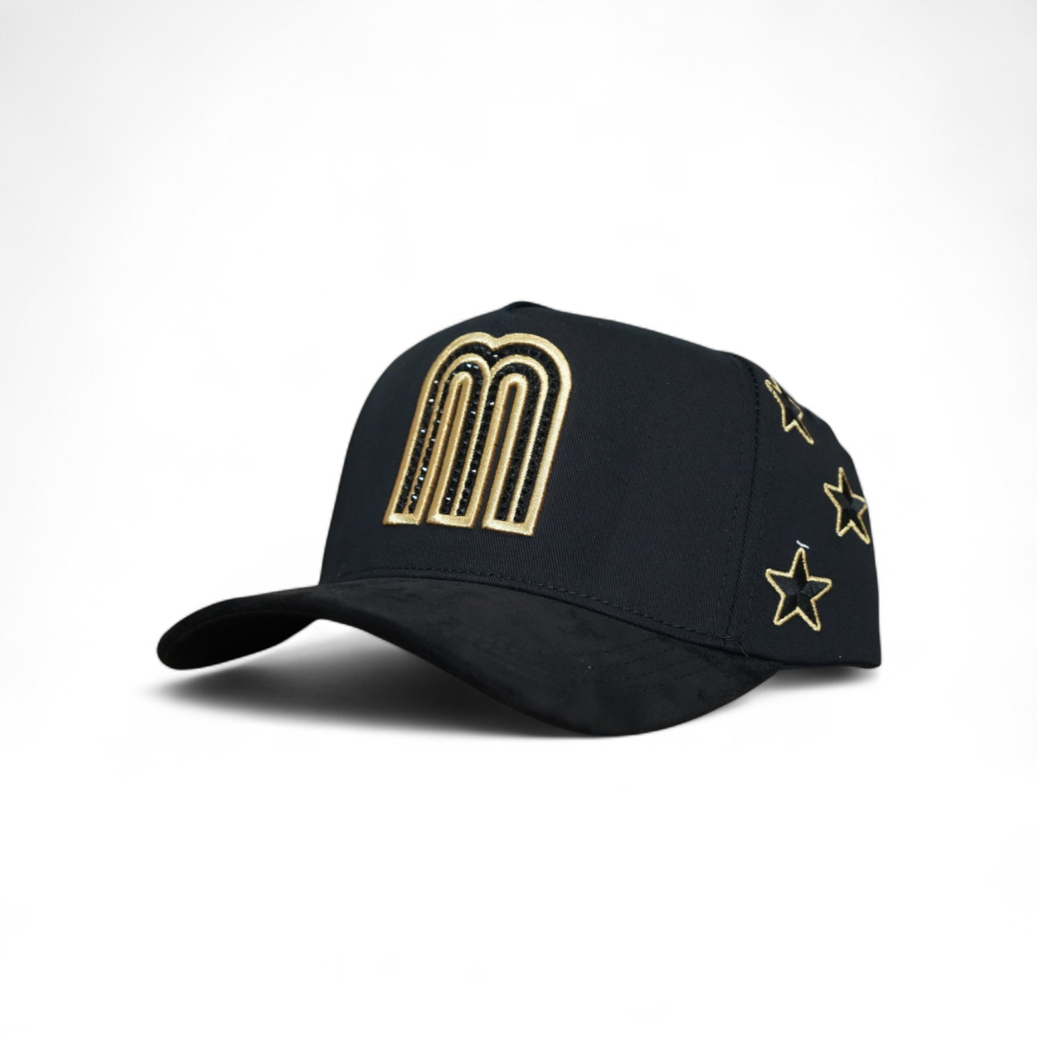 Sleek and modern, this black cap features a bold raised "M" logo detailed with black rhinestones for a subtle shine. Designed with a structured crown and a curved visor with a tonal camo pattern, it delivers both style and comfort perfect for everyday wear or a standout streetwear look.