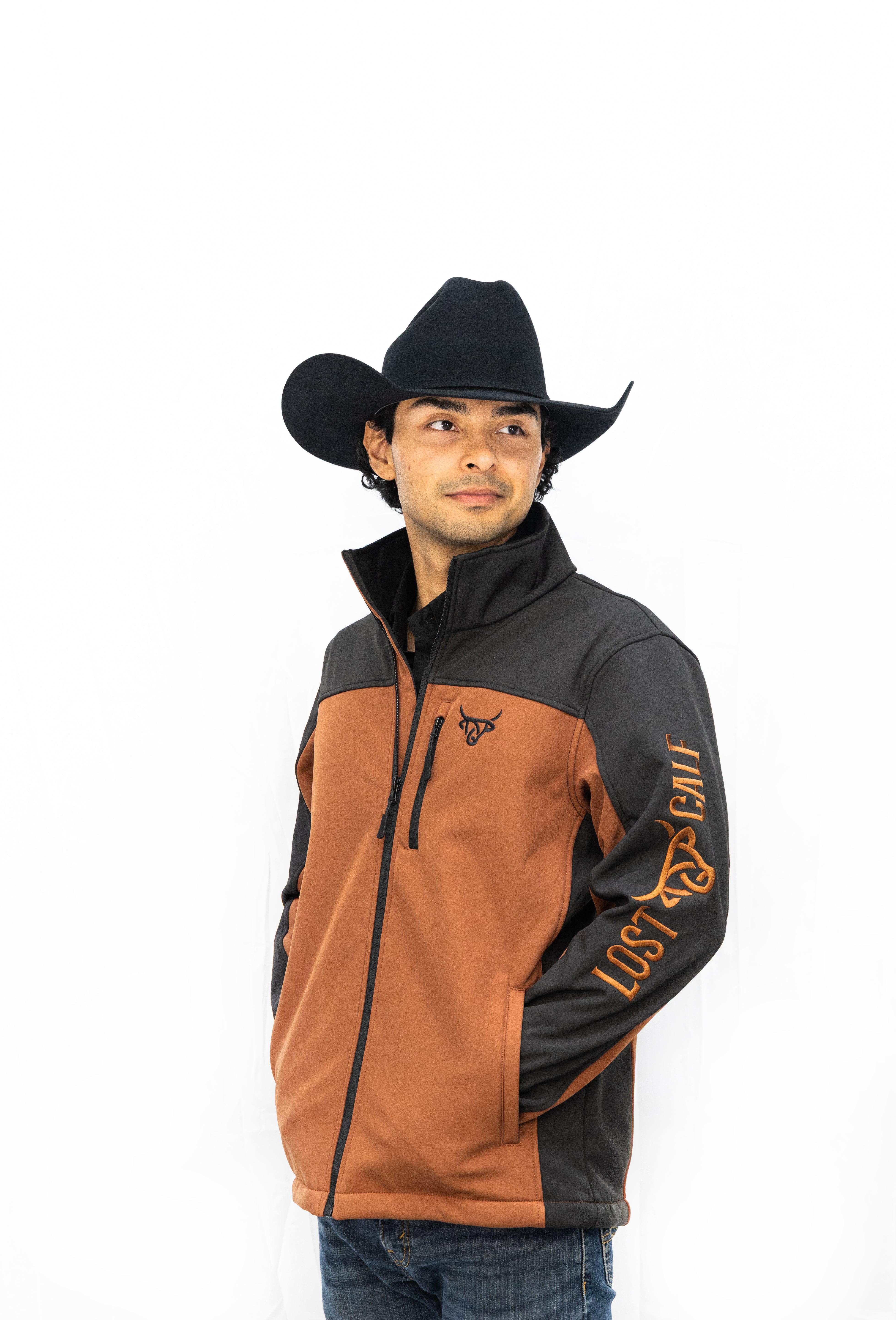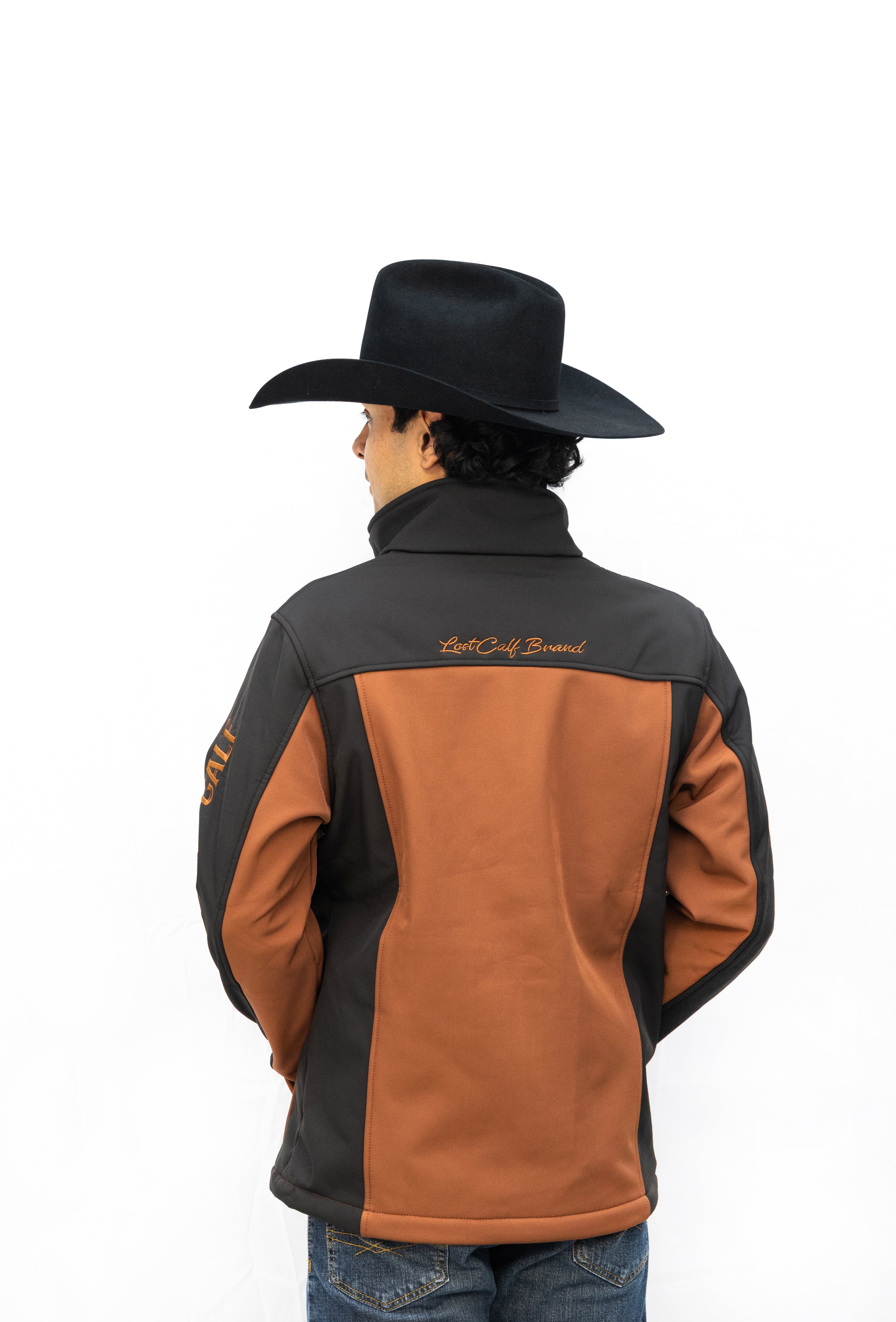 Black-Chrome Soft Shell Jacket with 1.5" Embroider LC logo on left chest & Lost Calf embroider Constructed in the back from polyester stretch woven shell, which is bonded to polyester microfleece with an added laminate film insert to repel water. The results is wind-resistant, water-resistant jacket with four-way stretch that's perfect for weekend wear.