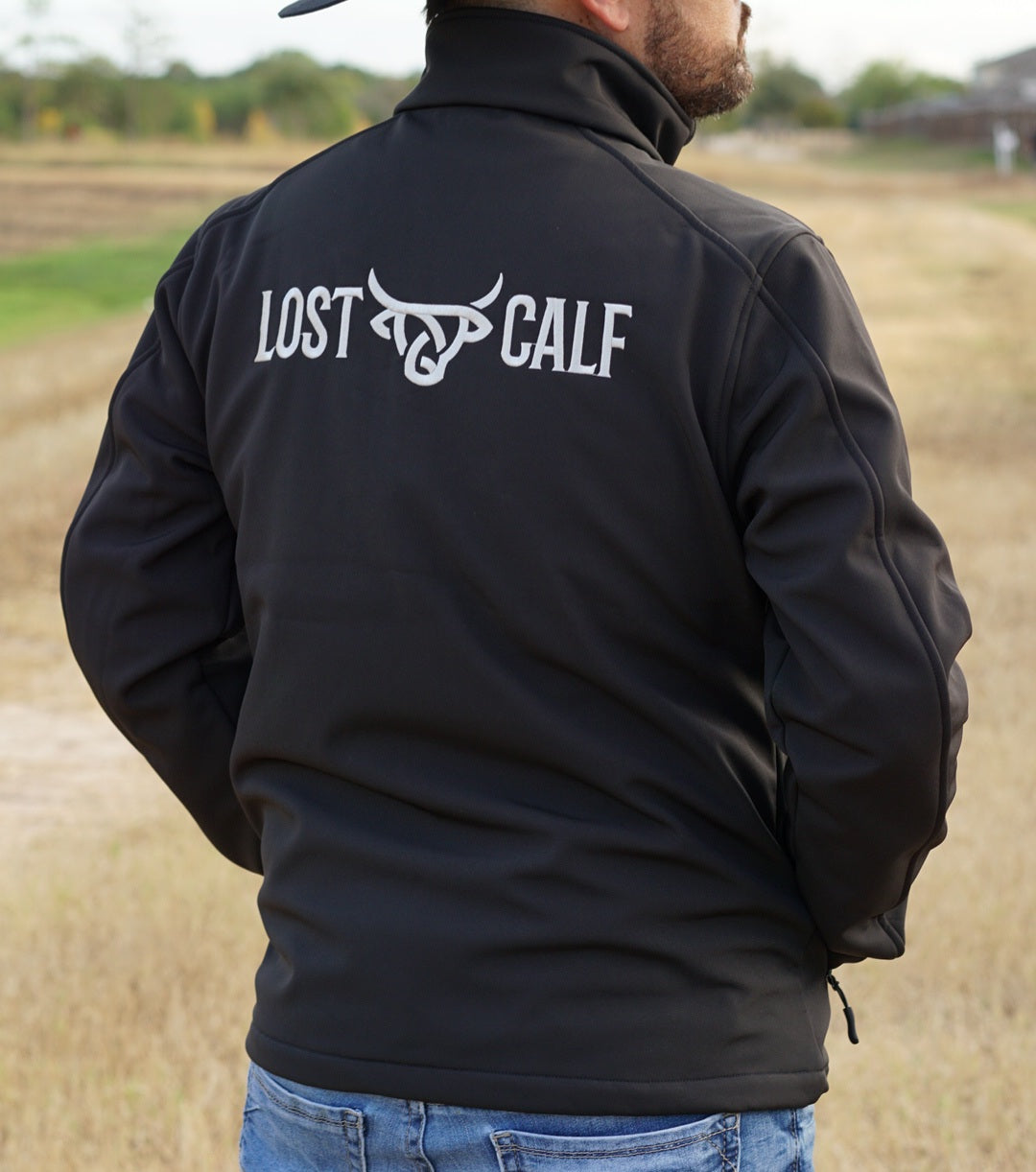 Black-Chrome Soft Shell Jacket with 1.5" Embroider LC logo on left chest & Lost Calf embroider Constructed in the back from polyester stretch woven shell, which is bonded to polyester microfleece with an added laminate film insert to repel water. The results is wind-resistant, water-resistant jacket with four-way stretch that's perfect for weekend wear.