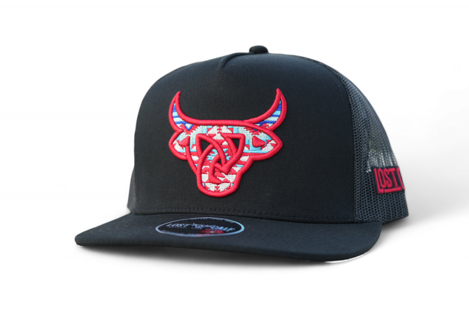 Baseball cap with Lost Calf logo embroidered on front in aztec patten bull with red stitch outline, Lost Calf stitched on left side. Snap back - one size fits all.